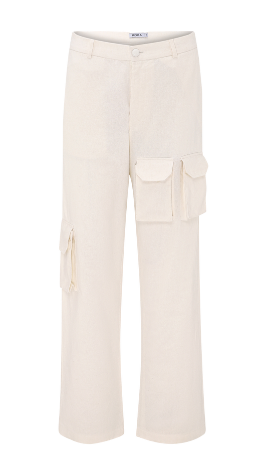 Regular price Dhs. 850.00 AEDRegular priceUnit price perSale price Dhs. 850.00 AEDLINEN CARGO PANTS WHITE